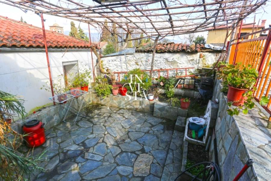 Η πέτρινη αυλή του ακινήτου, περιτριγυρισμένη από τοπική βλάστηση, προσκαλεί σε χαλαρές στιγμές κάτω από τη σκιά των δέντρων, απολαμβάνοντας τη μαγευτική θέα στις καταπράσινες πλαγιές του Κισσάβου.