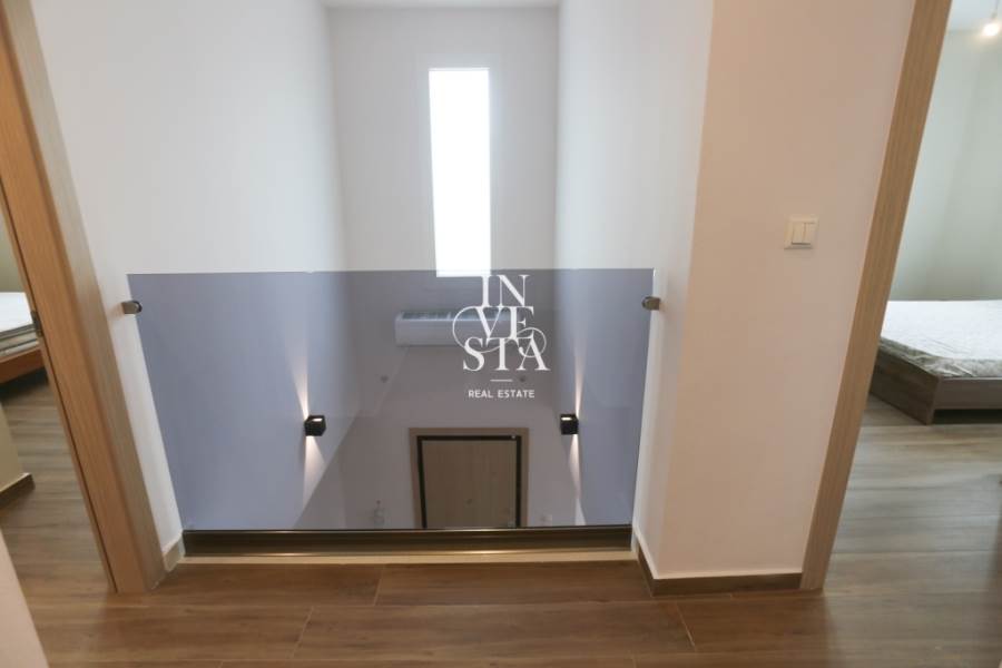 Στον όροφο των 85 τ.μ. συναντάμε μία κομψή εσωτερική βεράντα, δύο ευρύχωρα και φωτεινά υπνοδωμάτια με ντουλάπες, ένα μπάνιο και το master bedroom με βεστιάριο και ιδιωτικό μπάνιο.