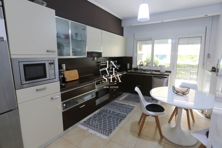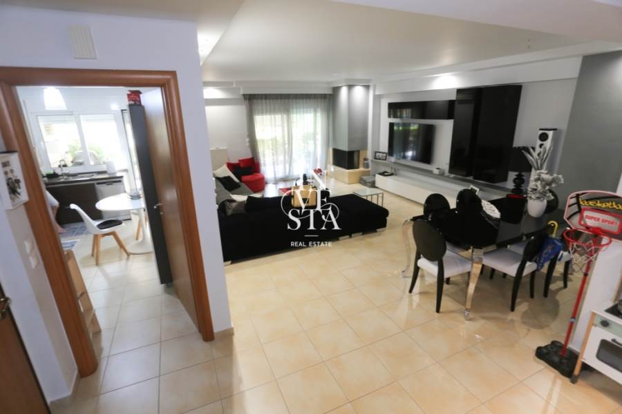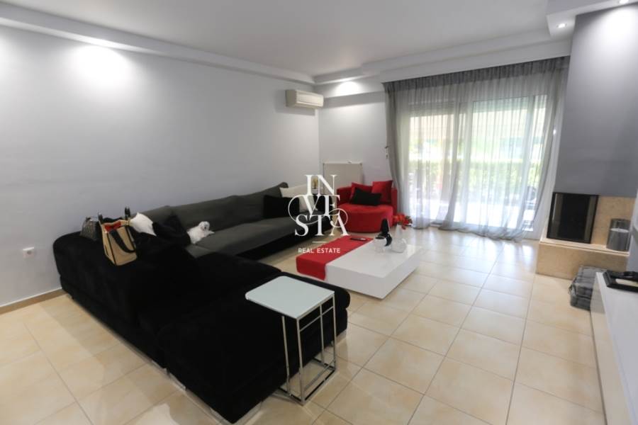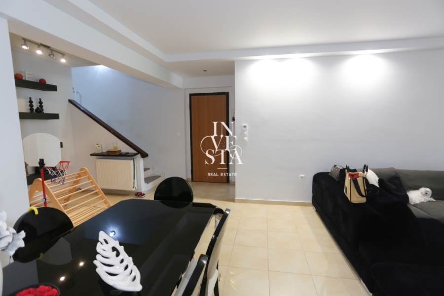 Στο ισόγειο, ο καλαίσθητος χώρος καθιστικού με το γωνιακό τζάκι αποτελεί το κέντρο της καθημερινότητας, ιδανικό για χαλάρωση ή φιλοξενία φίλων. Η ξεχωριστή κουζίνα προσφέρει άνεση και πρακτικότητα, με επαρκή χώρο για οικογενειακές συγκεντρώσεις και γεύματα. Από το ίδιο επίπεδο υπάρχει πρόσβαση στον ιδιωτικό χώρο αυλής, που χαρίζει αίσθηση ανεξαρτησίας και επιπλέον δυνατότητες αξιοποίησης.