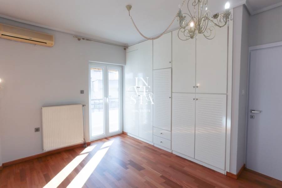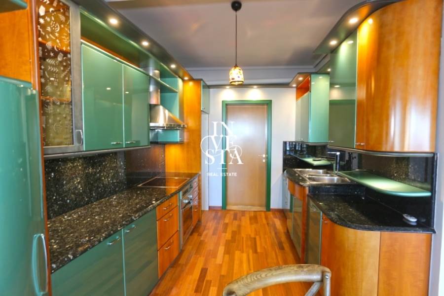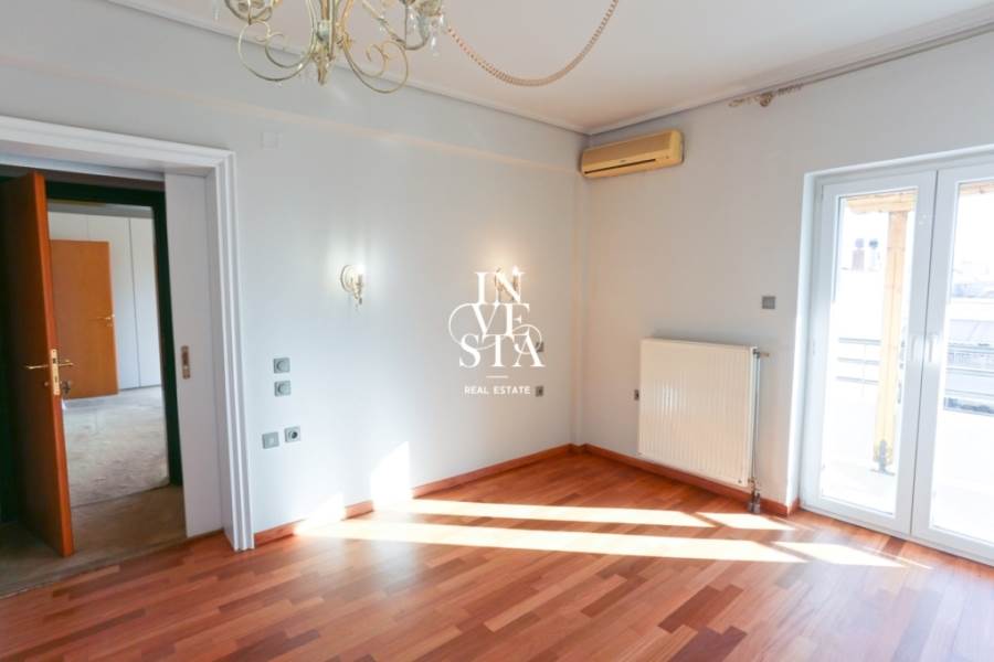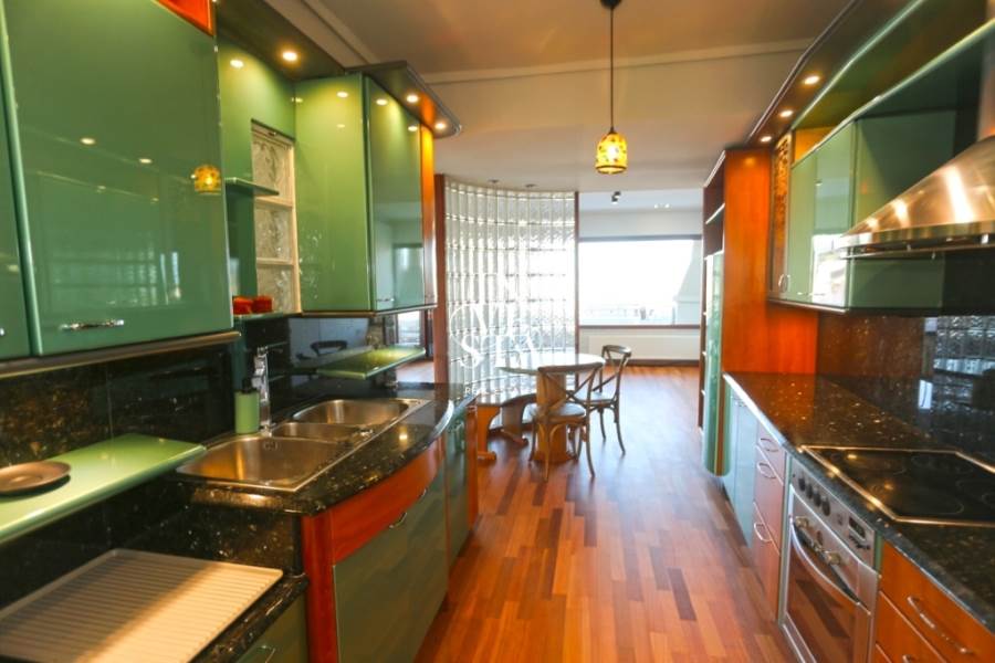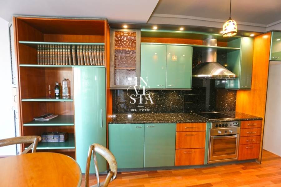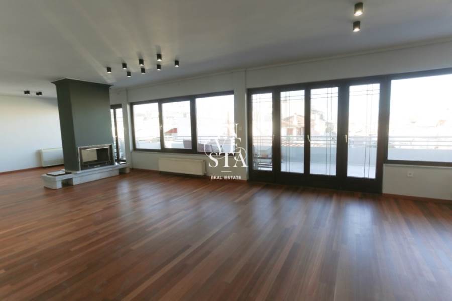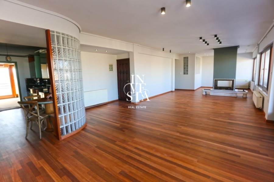 Το εσωτερικό του διαμερίσματος ξεχωρίζει για την υψηλή αισθητική του. Διαθέτει παρκέ εξαιρετικής ποιότητας, ενώ το τζάκι διπλής όψεως προσφέρει ζεστασιά και μοναδικό χαρακτήρα. Η κουζίνα είναι ιδιαίτερα μεγάλη, πλήρως λειτουργική και κατασκευασμένη με υλικά υψηλής ποιότητας, εξοπλισμένη με εντοιχισμένη ηλεκτρική κουζίνα και πλυντήριο πιάτων. Χωρίζεται με κομψότητα από τον υπόλοιπο χώρο με καμπύλο τοίχο από υαλοτούβλα, προσδίδοντας ξεχωριστή αρχιτεκτονική πινελιά.