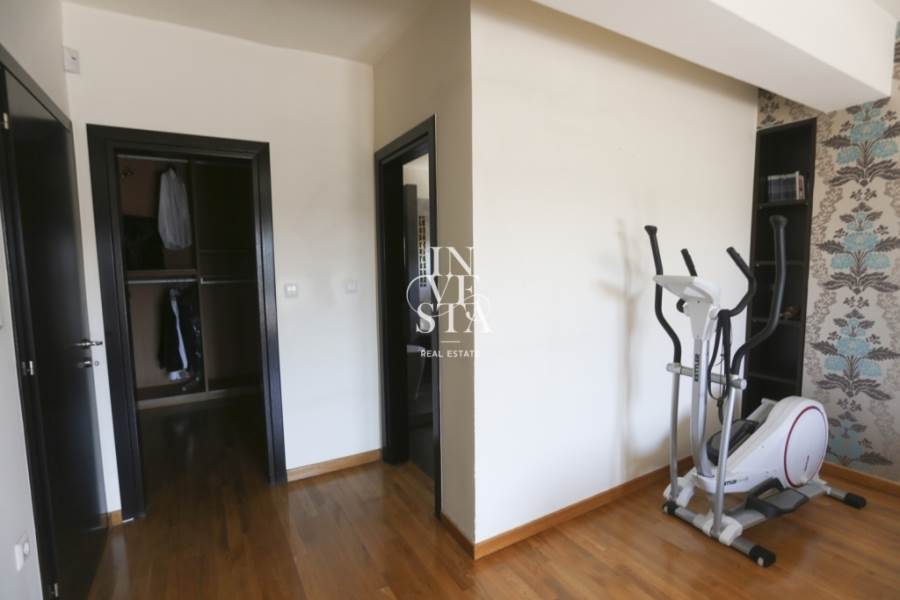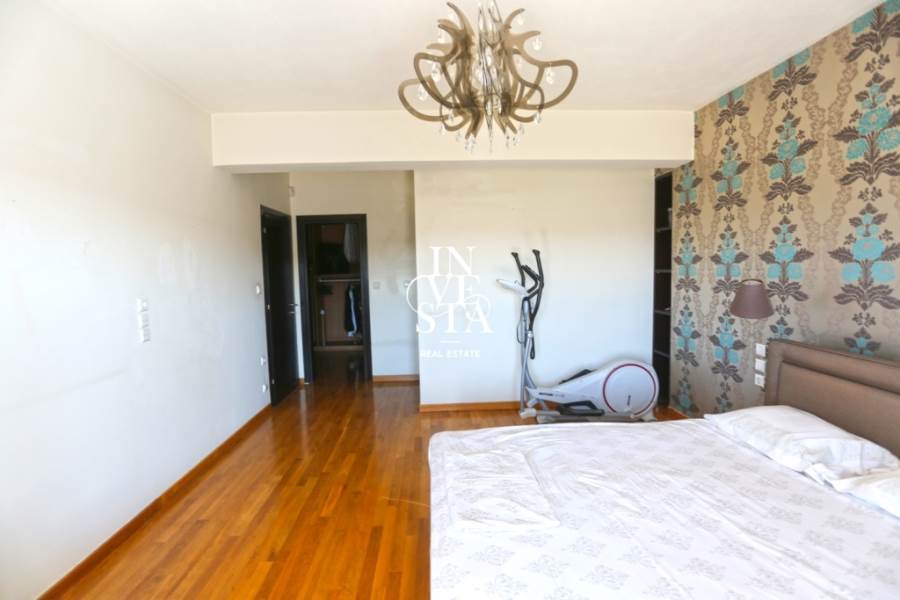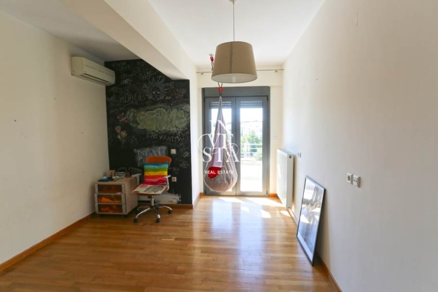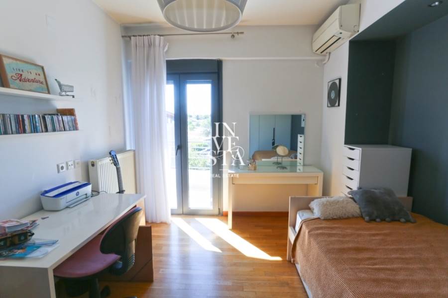 Going up to the second floor of the 135 sq m residence, the most private and peaceful area of the house is revealed, the bedroom area. Four bedrooms, all spacious, bright, with parquet floors and large openings, are waiting to accommodate the most relaxing moments of the residents. All have large built-in wardrobes, while the master bedroom stands out with its own spacious dressing room lined with wood and private bathroom, offering the ultimate sense of independence and luxury. On this floor there is also a large bathroom, as well as a practical utility room with facilities for a washing machine and dryer.
