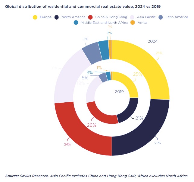 Ανάμεσα στις περιοχές, η Βόρεια Αμερική σημείωσε τη μεγαλύτερη άνοδο (+44% από το 2019), αυξάνοντας το μερίδιό της στην παγκόσμια αξία ακινήτων από 21% σε 25%. Η ανάπτυξη αυτή οφείλεται στη σταθερή οικονομία των ΗΠΑ και σε νέες κατασκευές.