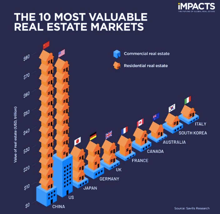 Η Κίνα διατηρεί τη θέση της ως η ακριβότερη αγορά ακινήτων παγκοσμίως, με 23,5% της συνολικής αξίας, ενώ οι ΗΠΑ ακολουθούν με 20,7%. Την πρώτη δεκάδα συμπληρώνουν Ιαπωνία, Γερμανία, Ηνωμένο Βασίλειο, Γαλλία, Καναδάς, Αυστραλία, Νότια Κορέα και Ιταλία – με συνολικό μερίδιο 71% της παγκόσμιας αξίας.